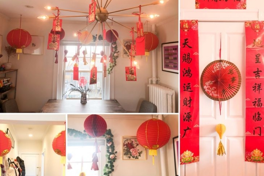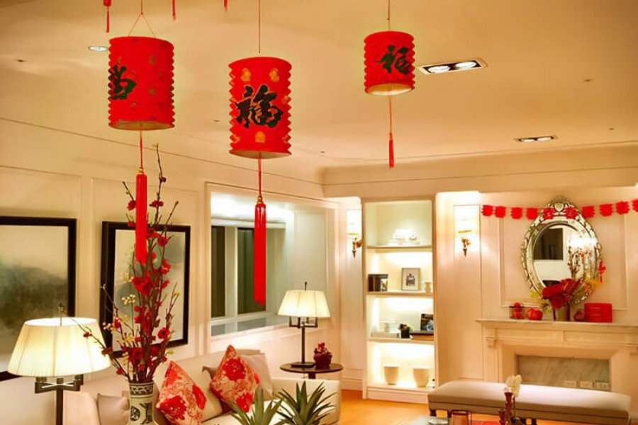 Đèn lồng đỏ tượng trưng cho may mắn, phồn vinh. Trước khi treo đèn, cần lau dọn trần nhà và các góc tường để không gian thêm sạch sẽ. Treo đèn ở cửa ra vào hoặc góc phòng tạo điểm nhấn lung linh, rực rỡ.