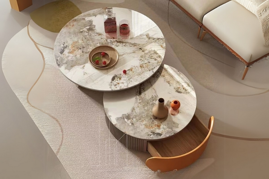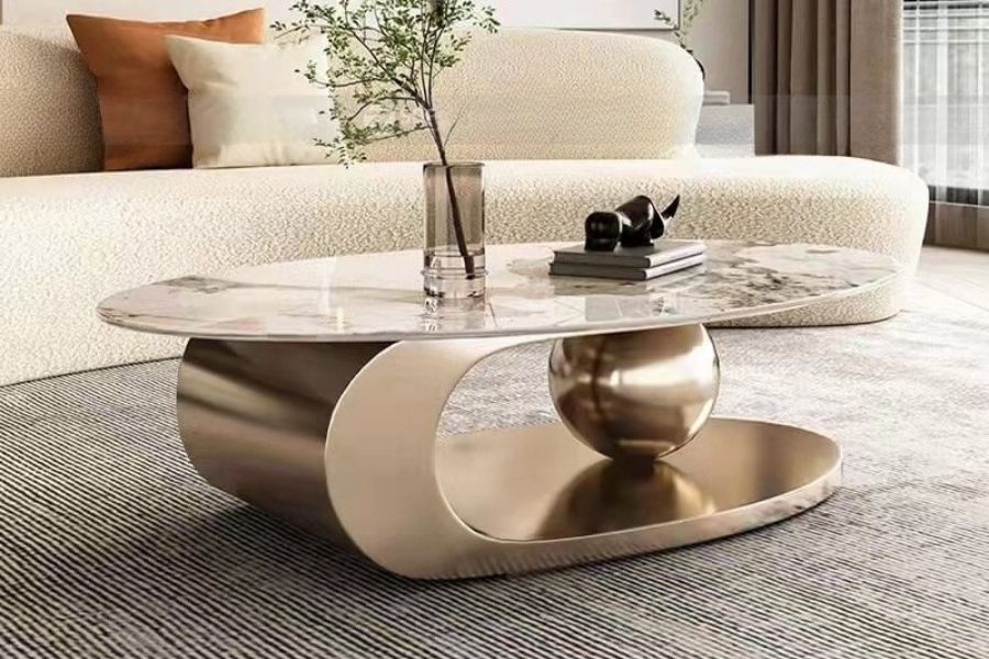 Bàn trà màu đồng là điểm nhấn hoàn hảo cho phòng khách ngày Tết, tạo nên vẻ đẹp sang trọng và hiện đại.