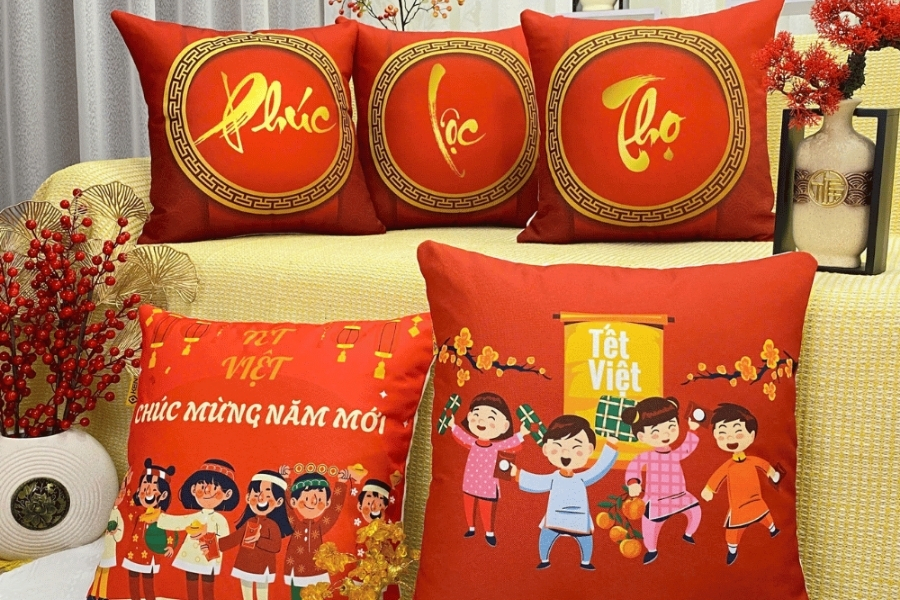 Bạn có thể chọn những sản phẩm có họa tiết về Tết và đặt ở những vị trí trang trọng như bàn trà, kệ tủ hoặc góc phòng sẽ giúp phòng khách thêm nổi bật và cuốn hút hơn.