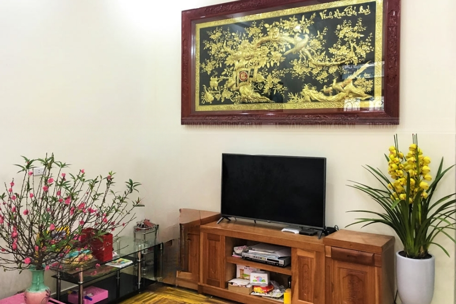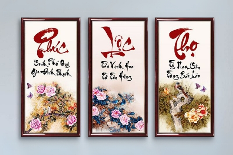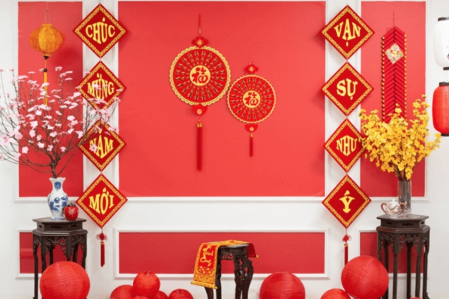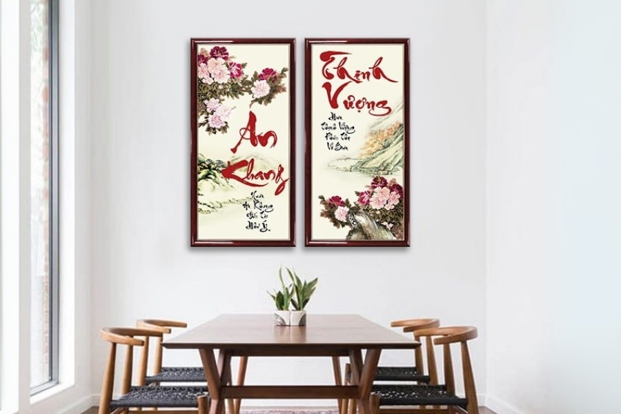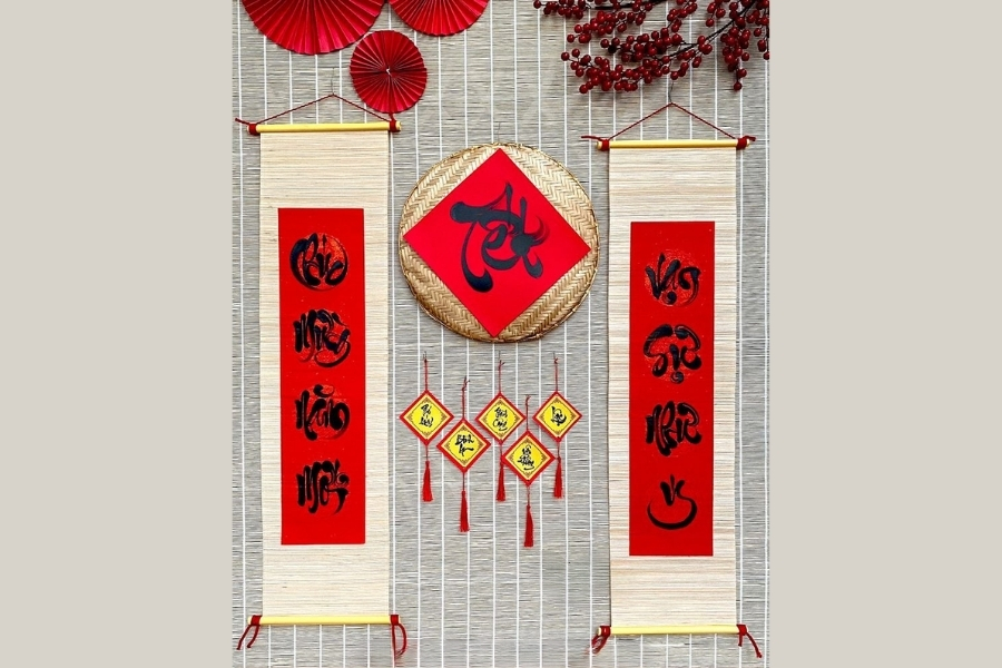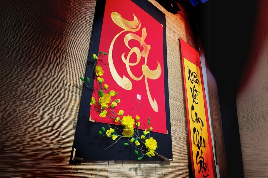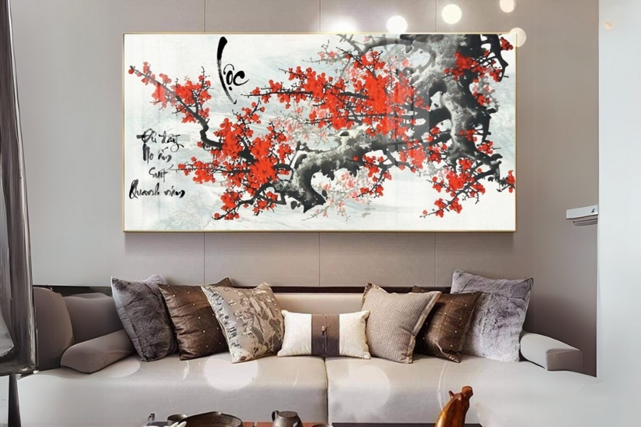 Bạn có thể chọn câu đối đỏ hoặc bức thư pháp với chữ “Phúc”, “Lộc”, “Thọ” để treo ở phòng khách. Đặt ở vị trí trang trọng như gần bàn thờ, trên kệ hoặc trung tâm phòng khách sẽ giúp không gian thêm ấm cúng và đậm chất Tết truyền thống.