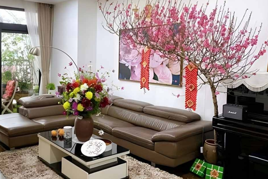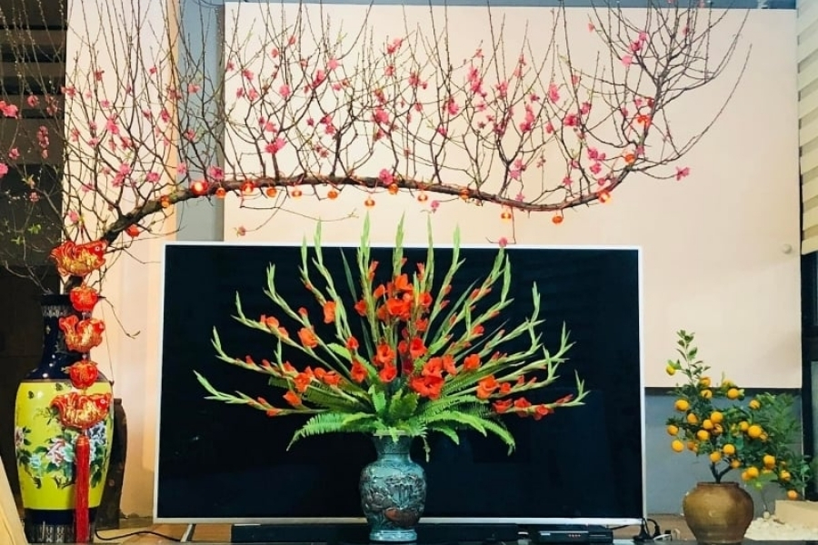 Bạn có thể đặt bình hoa trên bàn trà, kệ tivi hoặc những vị trí trung tâm để tạo điểm nhấn và lan tỏa không khí Tết. Một căn phòng gọn gàng, tinh tươm sẽ giúp sắc hoa thêm nổi bật, mang đến cảm giác ấm cúng và tươi mới.