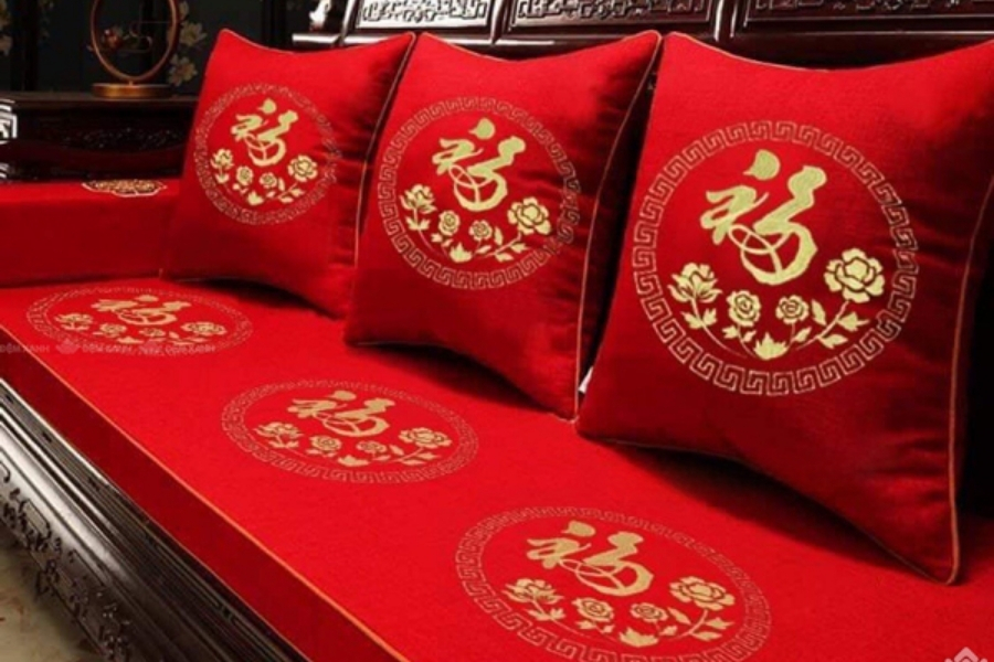 Bộ gối ôm và vỏ bọc sofa với họa tiết hoa đào, mai vàng mang đến không khí xuân tươi mới cho phòng khách. Chất liệu vải cao cấp kết hợp với các hoa văn truyền thống không chỉ tạo cảm giác êm ái mà còn nâng tầm thẩm mỹ cho không gian.