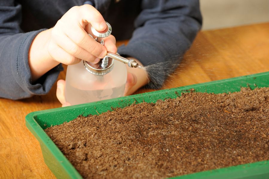 - Bước 4: Dùng bình xịt phun sương tưới nước tạo độ ẩm cho đất. Sau đó dùng bay xới nhẹ lớp đất phía trên để chuẩn bị gieo hạt.