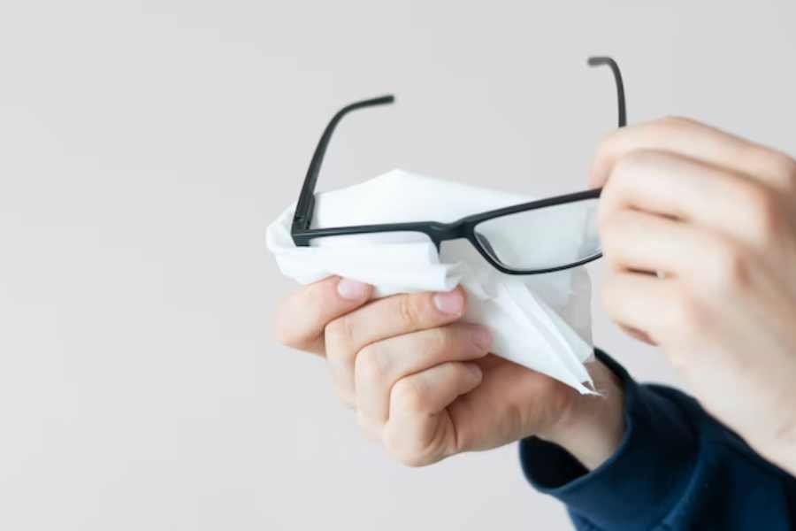 Không nên dùng khăn giấy để lau kính cận vì chúng có thể chứa các hạt bụi nhỏ có thể làm xước kính. Nên sử dụng khăn mềm để làm sạch và lau khô.