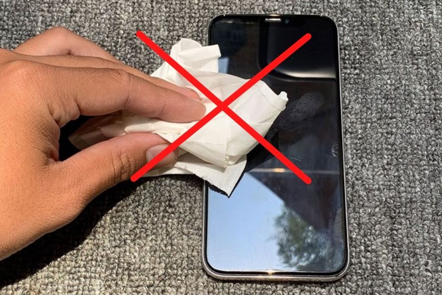 Đa số khăn giấy thường khá thô và ráp. Mặc dù chúng có thể lau sạch được màn hình điện thoại nhưng cũng có thể để lại một vài vết xước trên đó. Chưa kể nếu bạn làm ẩm khăn giấy để vệ sinh thì chúng rất dễ bị rách và có thể bám vào các khe trên điện thoại. Bạn cần phải tốn khá nhiều công sức để lấy những mảnh vụn đó ra.