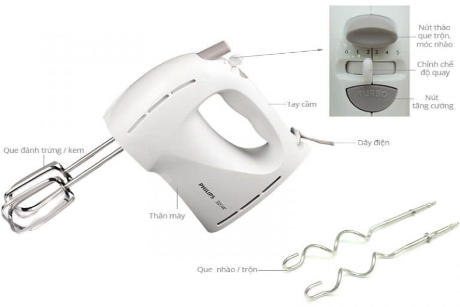 Máy đánh trứng cầm tay gọn nhẹ, linh hoạt, dùng để đánh trứng, đánh kem, trộn bột với khối lượng nhỏ trong thời gian không quá lâu…