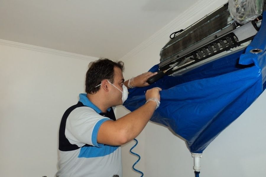 Trước khi vệ sinh lưới lọc, bạn cần trùm túi vệ sinh máy lạnh vào toàn bộ dàn lạnh để hứng nước thải trong quá trình vệ sinh.
