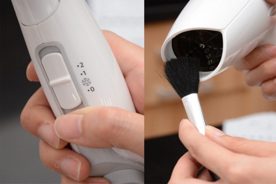 Để thực hiện vệ sinh bộ phận thổi khí, bạn cắm điện và sử dụng máy ở số thấp nhất. Dùng bàn chải từ từ chải cho tóc và bụi ra khỏi máy.