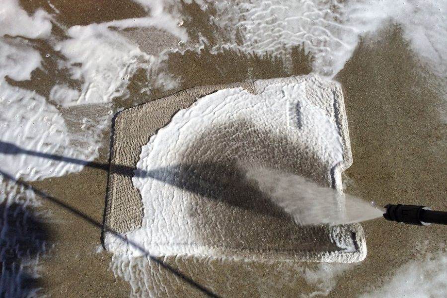 - Bước 3. Xả thảm sàn trước vòi nước áp suất lớn nhằm loại bỏ một phần bụi mịn và làm ướt bề mặt