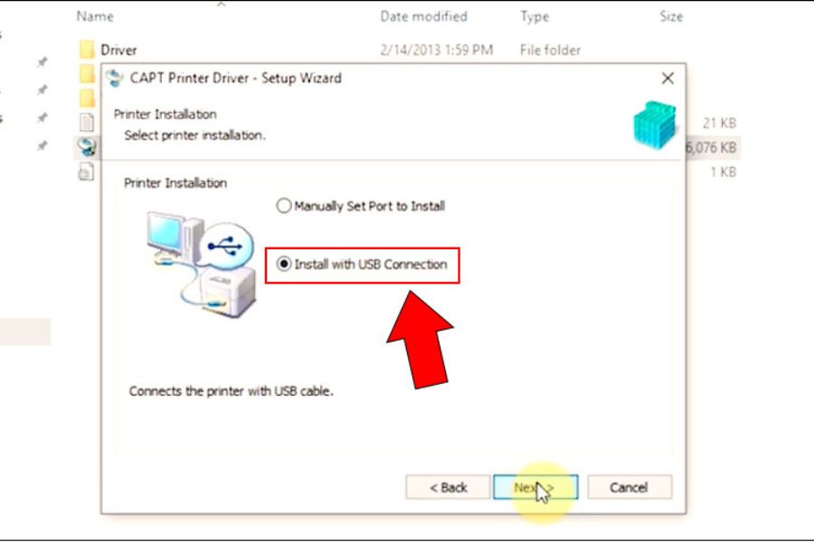 Bạn lần lượt chọn “Next” và “Yes” sau mỗi thông báo hiện lên → CAPT Printer Driver → Install with USB Connection → Next → Restart My Computer Now → Exit.