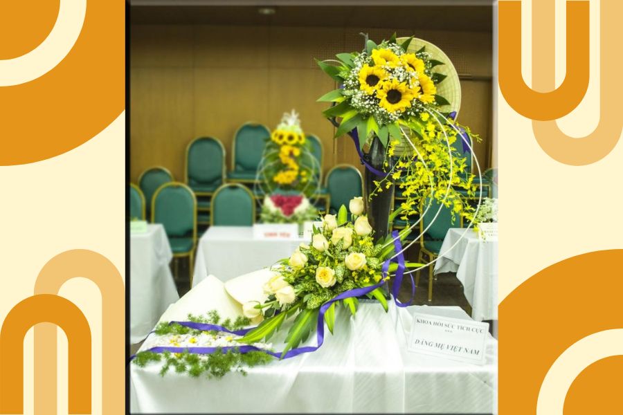Hoa đồng tiền màu cam nổi bật tượng trưng cho người mẹ với tình yêu thương thiêng liêng, cao quý, luôn hướng về con. Hoa hồng vàng đại diện cho những đứa con, dù đã trưởng thành nhưng vẫn luôn mong muốn được mẹ chở che, bảo vệ. Xen kẽ giữa những bông hoa hồng là những bông hoa li ti, tượng trưng cho sự che chở, bao bọc và lòng hiếu thảo của con cái.