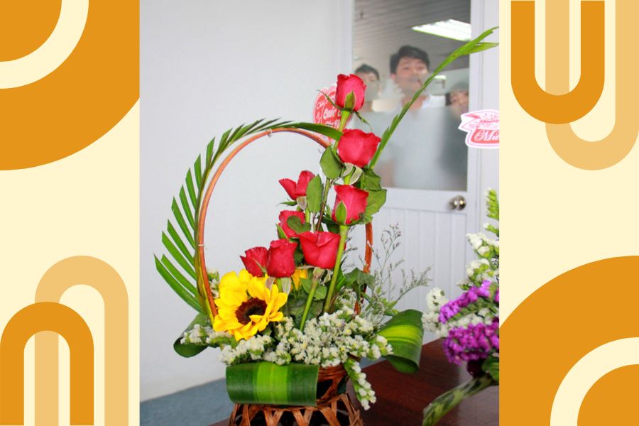Để cắm hoa theo cách này, bạn hãy lựa chọn những bông hoa hồng thật tươi và đặt ở trên, dưới đó là một bông hoa hướng dương rực rỡ. Kết hợp cùng các loại hoa khác và lá xanh tươi sẽ tạo nên một giỏ hoa sống động và đầy ý nghĩa để chào đón ngày 8/3.