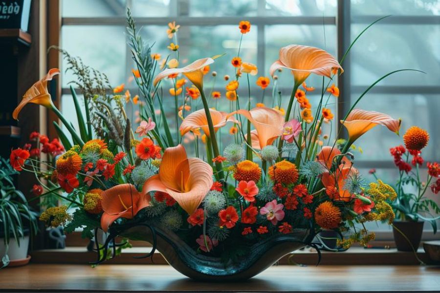 Để tạo nên một “chiếc thuyền hoa” độc đáo, bí quyết nằm ở sự sắp xếp đối xứng và canh chỉnh chiều dài chuẩn xác. Các nhành hoa được xếp đặt cân đối hai bên, tạo hình con thuyền đầy đặn và thu hút.