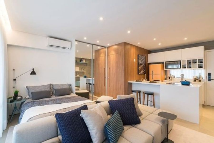 - Căn hộ Studio được thiết kế khéo léo để tạo không gian chung cho mọi hoạt động trong nhà. Để thuận tiện, tất cả các khu vực đều có thể đi lại dễ dàng thậm chí là không có vách ngăn để mang đến sự tiện lợi.