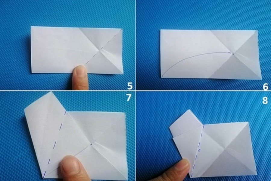 Bước 6: Kéo góc giấy vào vị trí giao nhau được đánh dấu như hình 6 rồi ép phẳng giấy xuống cho thành nếp.