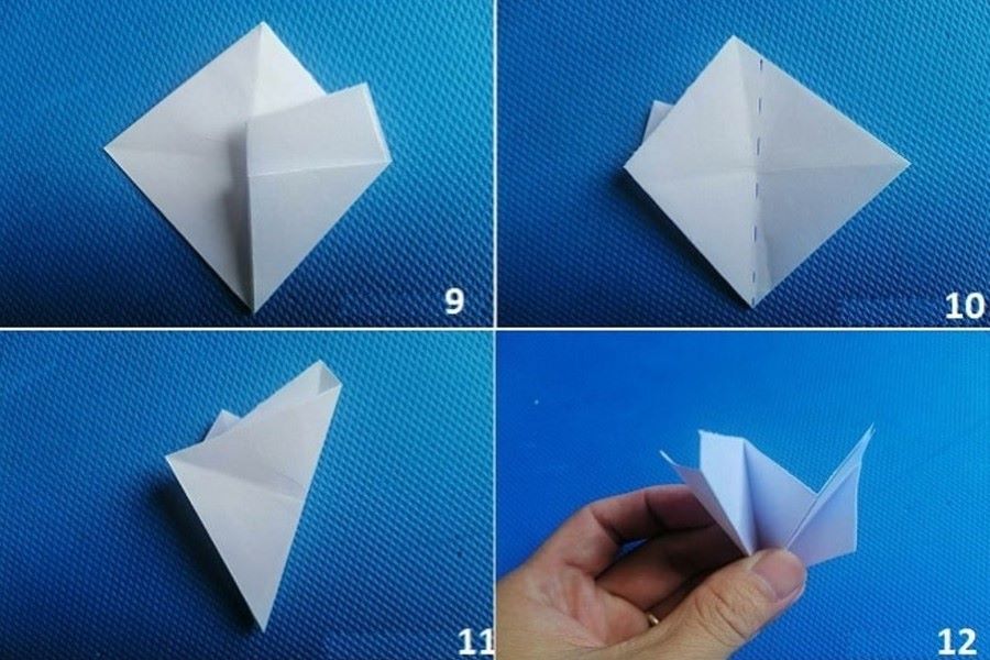 Sau khi gấp hai bên, bạn sẽ thấy xuất hiện bốn đỉnh, kéo hai đỉnh vào giữa để tạo đáy và cố định lại bằng keo sữa hoặc keo hai mặt.