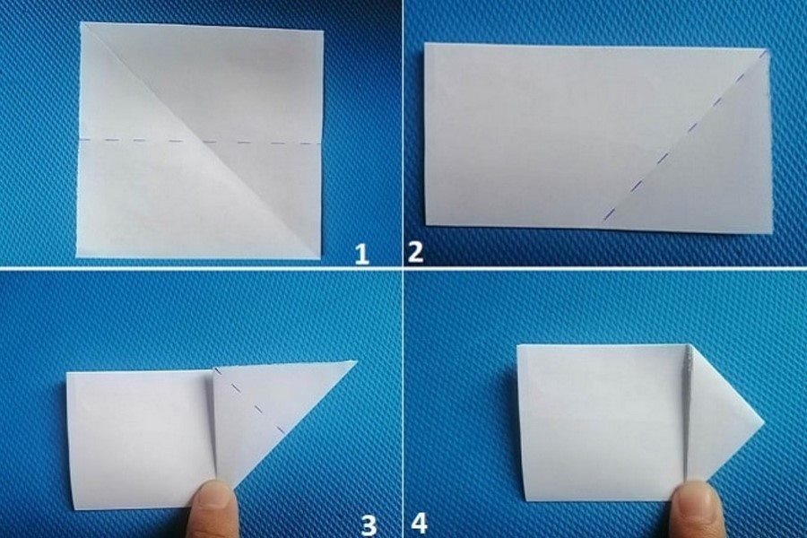 Bước 2: Gấp đôi tờ giấy như hình 1. Tiếp tục gấp lên một góc 45 độ như hình 2.