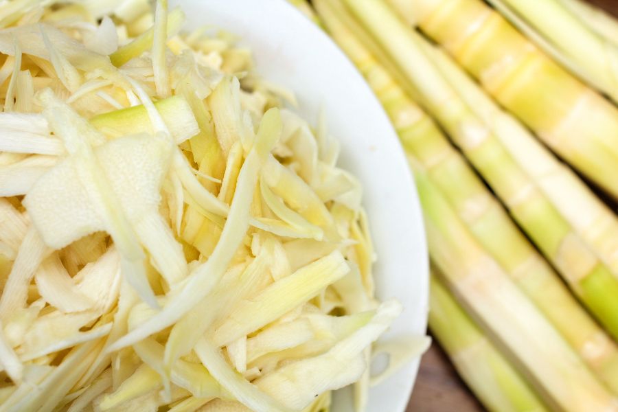 - Măng chua luộc khoảng 2 – 3 lần cho loại bỏ độc tố, tước cọng vừa ăn, vắt ráo nước.