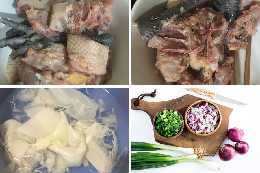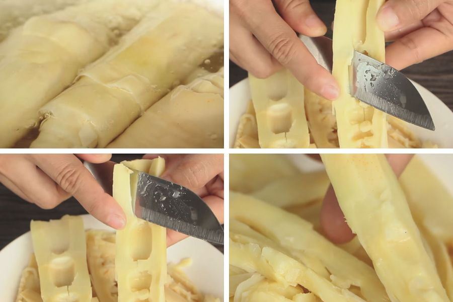 Cần luộc măng 2 – 3 lần để loại bỏ độc tố trong măng (cyanide). Sau đó rửa sạch lại nhiều lần, tước thành sợi nhỏ theo chiều dọc.