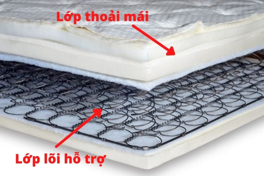 Lớp thoải mái ở trên sẽ làm từ các chất liệu mang lại độ êm ái cho người nằm. Lớp lõi sẽ là một bộ khung tập hợp nhiều lò xo liên kết lại với nhau và đóng vai trò nâng đỡ cho tấm nệm.