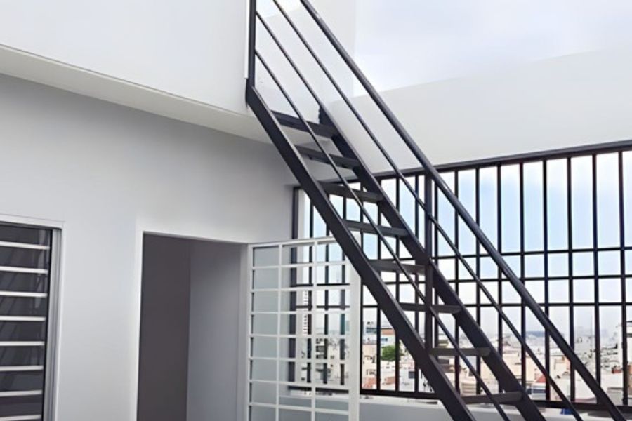Để nối không gian tầng trệt và sân thượng chắc chắn không thể bỏ qua mẫu cầu thang sắt lên sân thượng. Với chất liệu thường dùng là sắt mạ kẽm hoặc inox, loại cầu thang này đảm bảo độ bền cao và chống ăn mòn tốt.
