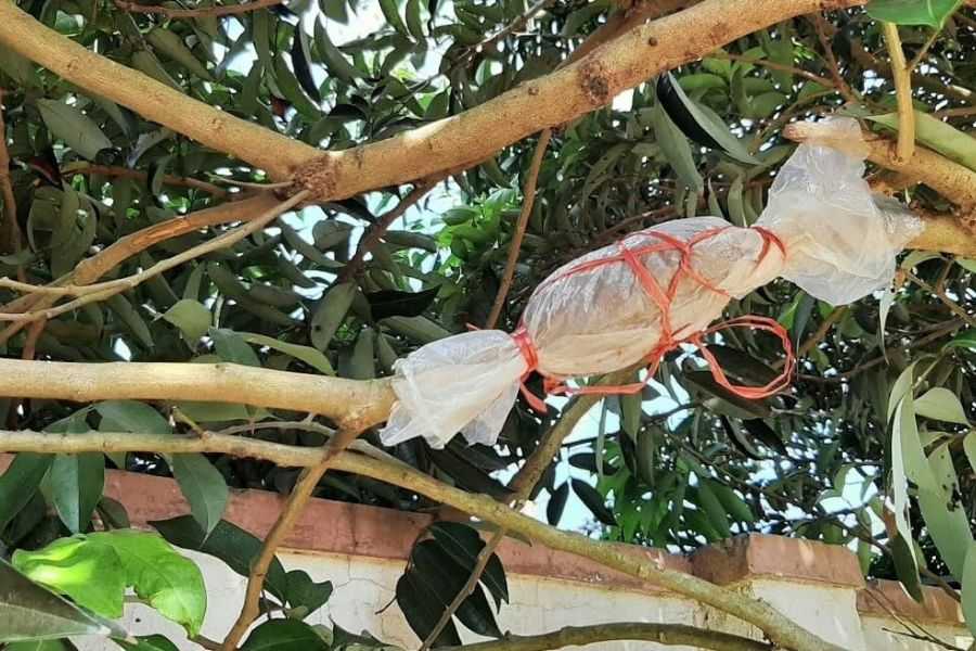 - Ở cây mẹ, bạn rạch 1 đoạn dài khoảng 5 đến 7cm và chờ 10 phút cho nhựa cây chảy hết. Sau đó, làm sạch chỗ để chiết trên thân cây và phần vừa rạch tưới thuốc kích thích mọc mầm lên. Khoảng 30 phút thuốc ngấm bạn tiến hành buộc túi bầu chiết.
