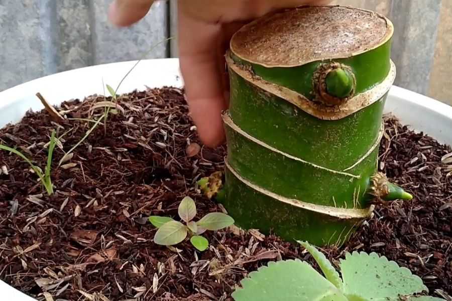 - Đặt phần gốc và thân cây nằm ngang rồi lấp một lớp đất mỏng lên trên và chỉ lấp qua mép của thân.