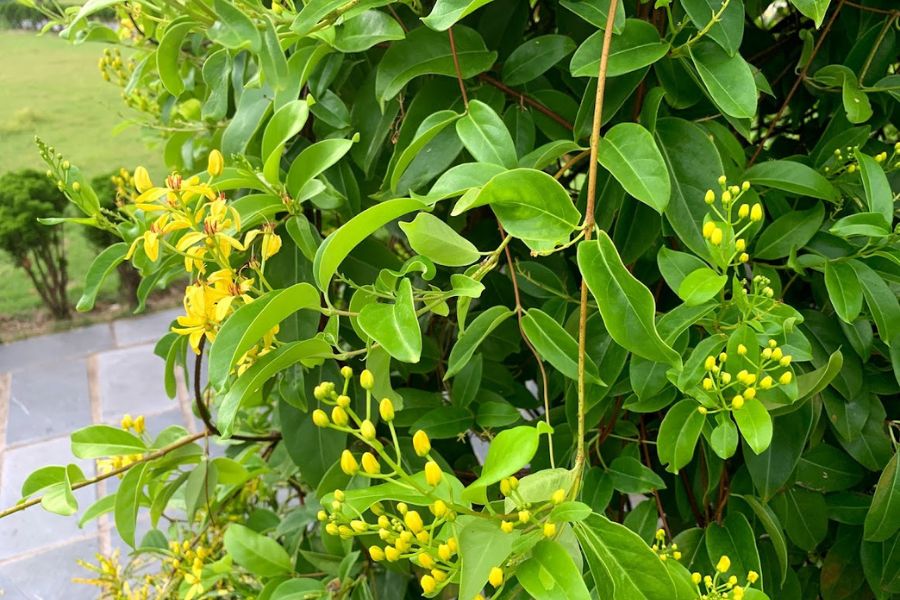 Cây leo hoa mai hoàng yến có thể phát triển lên đến chiều dài 6m và thường được trồng trang trí khu vườn hay ban công. Cây có tán lá rộng, lá xanh tươi và hoa toa, màu vàng sáng, rất nổi bật và hấp dẫn.