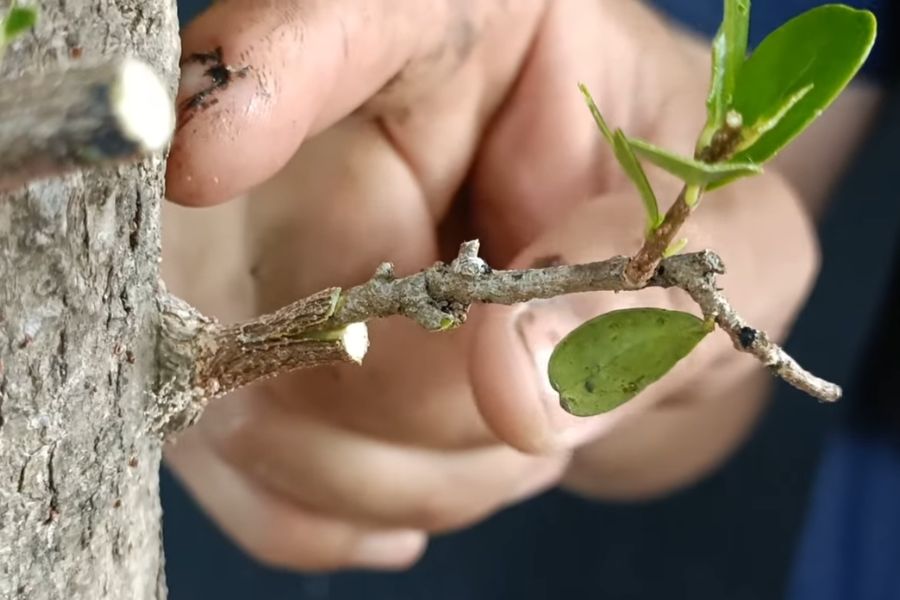 - Bước 3: Chọn cành cây Hải Châu con không quá già, không quá non, cắt hết lá. Dùng dao sắc nhọn cắt vát 2 bên bo ghép.