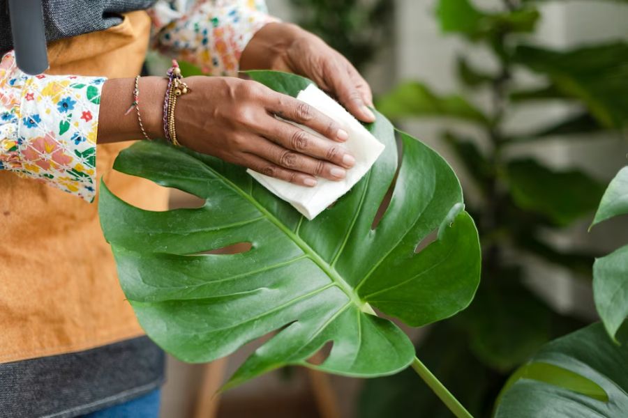 - Tưới nước: Để nước ẩm ướt vào mùa đông và tưới phun 2 – 3 lần/tuần vào mùa hè. Ngoài ra, bạn nên sử dụng miếng bọt biển ẩm ướt để vệ sinh lá.