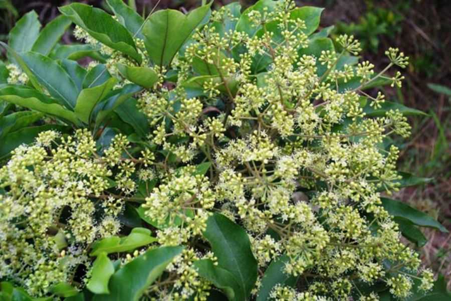 Hoa của cây xuyên gia bì nhỏ, hương thơm nhẹ, màu trắng hoặc xanh và thường mọc thành cụm ở đầu cành. Sau một thời gian hoa kết trái và cho ra những quả hình cầu dẹt, mọng, khi chín có màu tím đen. Loài cây này được chăm sóc kỹ càng có thể phát triển tốt ở trong điều kiện thiếu ánh sáng.