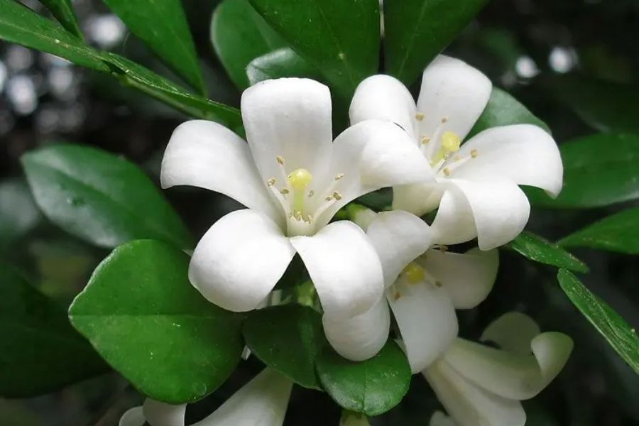 Hoa nguyệt quế thuộc loại đơn tính, màu trắng, có mùi thơm dịu nhẹ rất đặc trưng. Mỗi bông hoa có khoảng 5 đài hoa màu xanh nhạt và 5 cánh hoa uốn cong về sau. Vì thuộc họ Cam nên nó sẽ khá giống với hoa bưởi, hoa cam, quýt,… Hoa sẽ nở rộ vào cuối mùa đông và đầu mùa xuân.