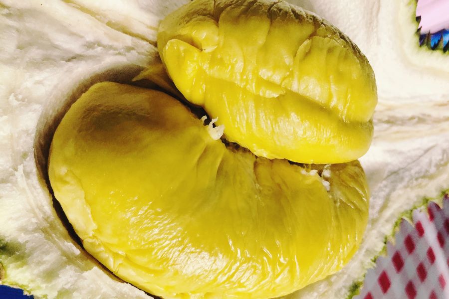 Phần cơm sầu riêng Musang King có màu vàng bắt mắt, dày và hạt lép. Khi ăn vị ngọt vừa phải, đắng nhẹ, béo giống như bơ khiến nhiều người ưa thích. Đặc biệt, giống sầu riêng này chỉ có thể thu hoặc khi quả tự rụng.