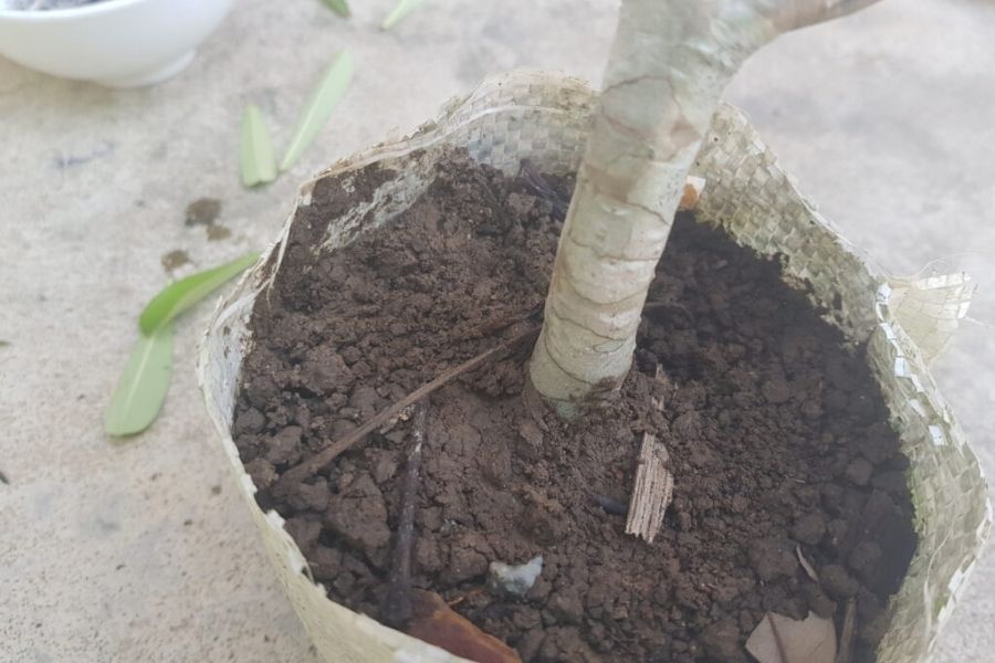 - Đặt cây hoa sứ vào chậu và chắc chắn rằng bộ rễ được chôn đều và đủ sâu trong đất. Sau đó, đổ đất vào chậu cho đến khi nó đầy.