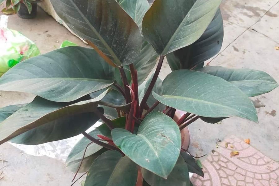 Trầu bà đế vương đỏ thường không có thân cây, lá to, có hình bầu dục và có màu đỏ tía. Cũng chính nhờ màu sắc thu hút này mà cây trầu bà đế vương đỏ thường thu hút sự quan tâm của nhiều gia chủ.