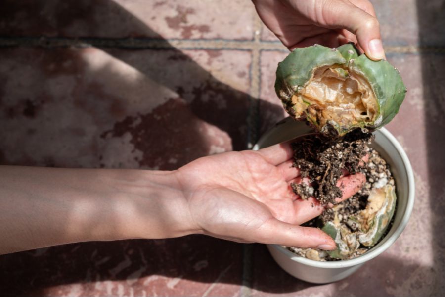 Xương rồng bị ngập nước có thể bị nấm thối với những đốm đen, trũng ở gốc, rễ và trên thân cây. Khi tình trạng bệnh nặng thì phần thân sẽ bị nhão và chảy nước, đôi khi cây sẽ rỉ nước mủ màu đen.