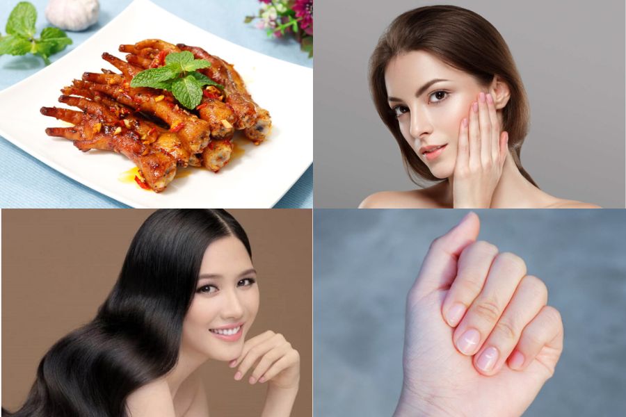 Hàm lượng protein dồi dào có trong chân gà rất có lợi cho da, tóc và móng. Protein được chỉ ra là thành phần quan trọng làm lên cấu trúc của tóc và móng giúp tóc và móng chắc khỏe hơn. Đồng thời chúng còn hỗ trợ quá trình tái tạo các tế bào da khỏe mạnh.