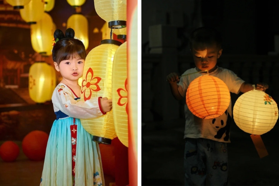 - Chụp ảnh cùng đèn lồng: Những chiếc đèn lồng nhiều màu sắc sẽ là đạo cụ tuyệt vời để tạo nên những bức ảnh đáng yêu cho bé.
