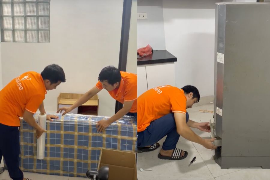 Sau đó, đội ngũ nhân viên sẽ tháo dỡ các thiết bị điện tử, đồ nội thất gỗ, tủ, kệ, và các vật dụng gắn trên kệ, tường. Tiếp theo, các mặt hàng cồng kềnh và thiết bị điện tử sẽ được bao bọc bằng màng PE để bảo vệ khỏi hư hỏng. Sau khi hoàn tất việc đóng gói theo từng loại đã phân loại, nhân viên sẽ dán nhãn và ghi chú rõ ràng trên các thùng carton để xác định nội dung và hướng dẫn di chuyển.