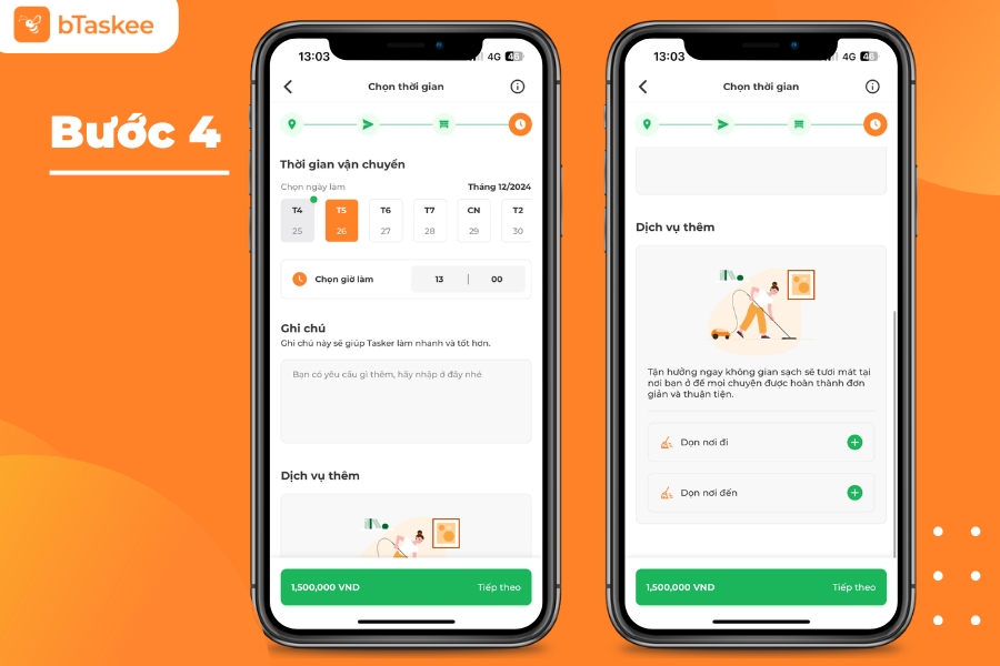 Bước 4: Chọn thời gian và tùy chọn 2 tiện ích dọn dẹp nơi đi, nơi đến.