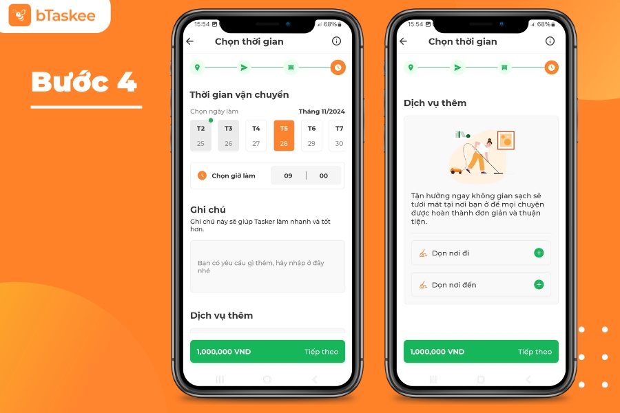 Bước 4: Chọn thời gian và tùy chọn 2 tiện ích dọn dẹp nơi đi, nơi đến