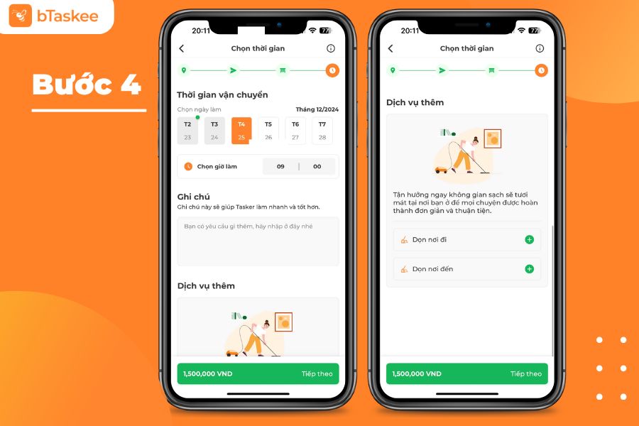 Bước 4: Chọn thời gian và tùy chọn 2 tiện ích dọn dẹp nơi đi, nơi đến.
