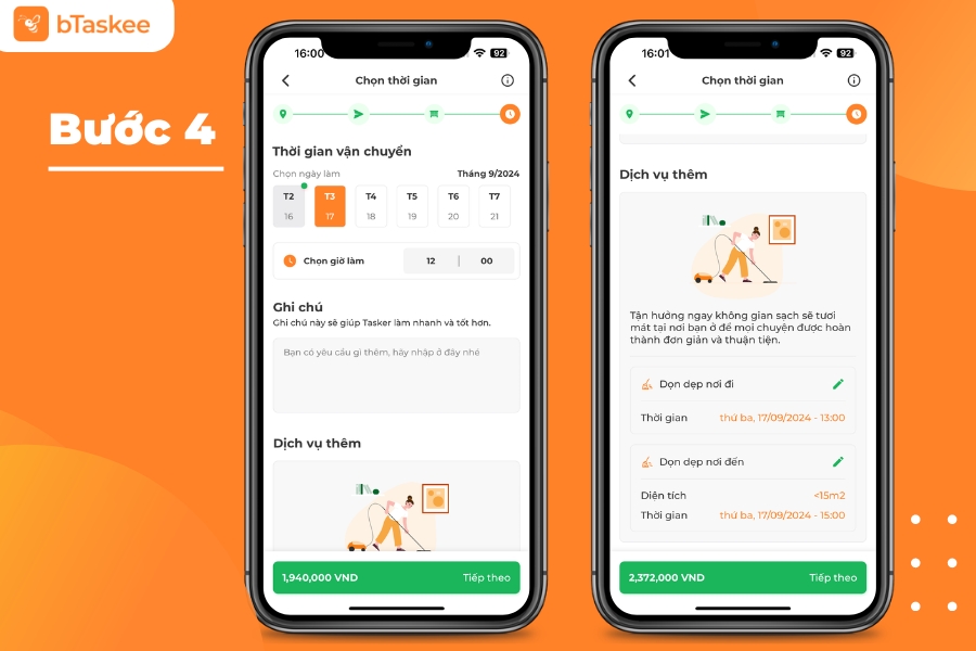 Bước 4: Đặt lịch và tùy chọn 2 tiện ích dọn dẹp nơi đi và nơi đến