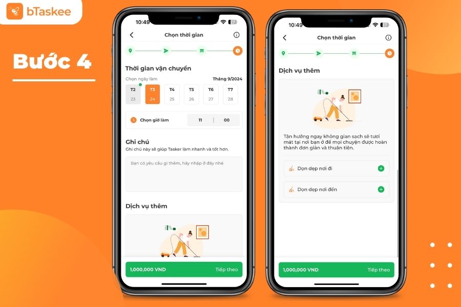 Bước 4: Chọn thời gian và tùy chọn 2 tiện ích dọn dẹp nơi đi và nơi đến