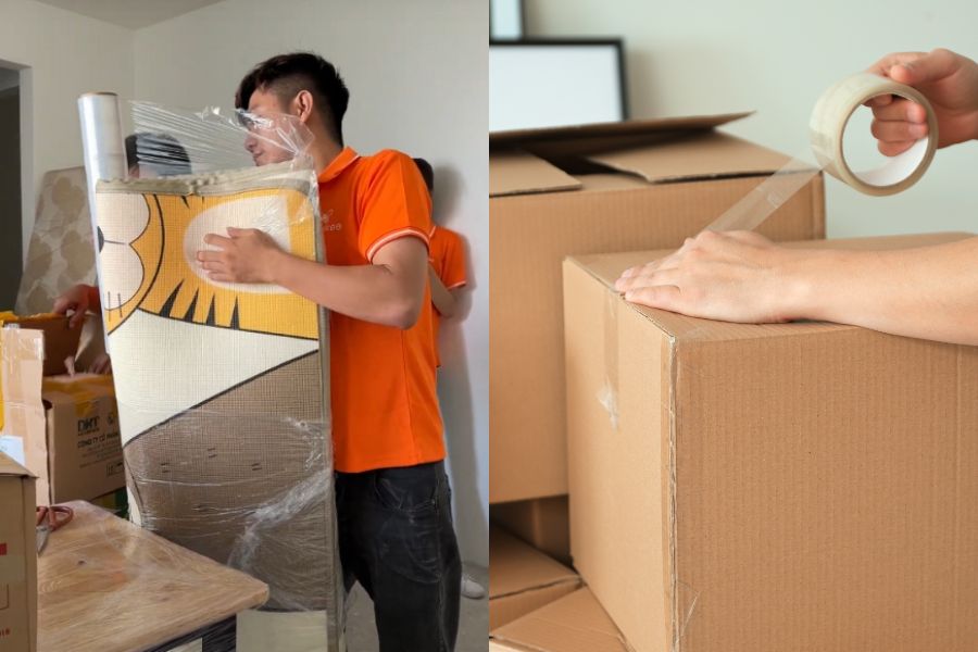 Đội ngũ của bTaskee thực hiện phân loại, tháo dỡ cẩn thận từ thiết bị điện tử đến đồ nội thất. Mỗi món đồ được bao màng PE, đóng gói chắc chắn trong thùng carton và dán tem nhãn rõ ràng để thuận tiện cho việc vận chuyển.