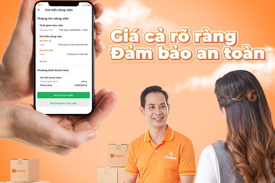 bTaskee đảm bảo giá cả dịch vụ rõ ràng, minh bạch ngay từ khi đặt lịch trên ứng dụng. Mọi thông tin về giá, đối tác vận chuyển và quy trình thực hiện đều được công khai chi tiết, giúp khách hàng an tâm tuyệt đối, không lo phát sinh chi phí.