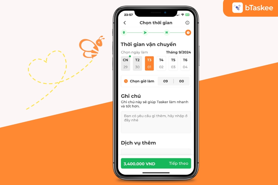 Bước 4: Chọn thời gian cần vận chuyển và dịch vụ thêm (nếu có)