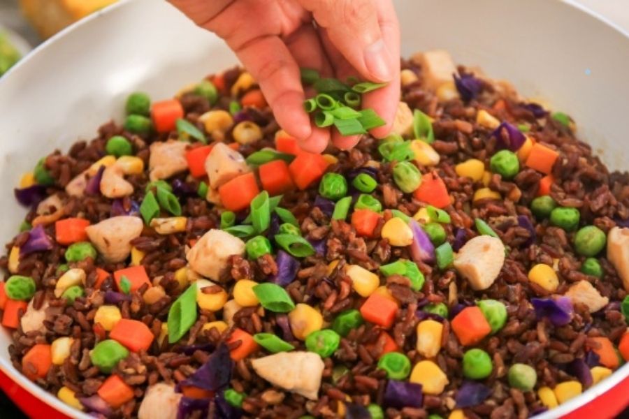 - Cơm chiên gạo lứt: Món ăn với thành phần chính là cơm gạo lứt có lượng calo thấp, giàu chất chống oxy hóa. Ngoài ra còn có thêm ức gà, đậu Hà Lan, cà rốt, trứng gà, gia vị, giúp bổ sung chất đạm, vitamin và chất xơ cho cơ thể, khiến bạn no lâu và hạn chế cảm giác thèm ăn.