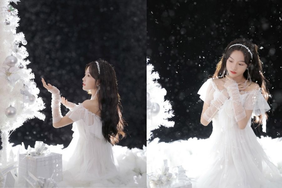 Khi lựa chọn concept này, bạn không cần đòi hỏi phải tạo dáng nhiều và cầu kỳ. Bạn chỉ cần chụp với tâm trạng thoải mái và tận hưởng khi vui đùa với tuyết giả. Chỉ vậy thôi là bạn đã có ngay một bộ ảnh đẹp thơ mộng và nữ tính rồi.