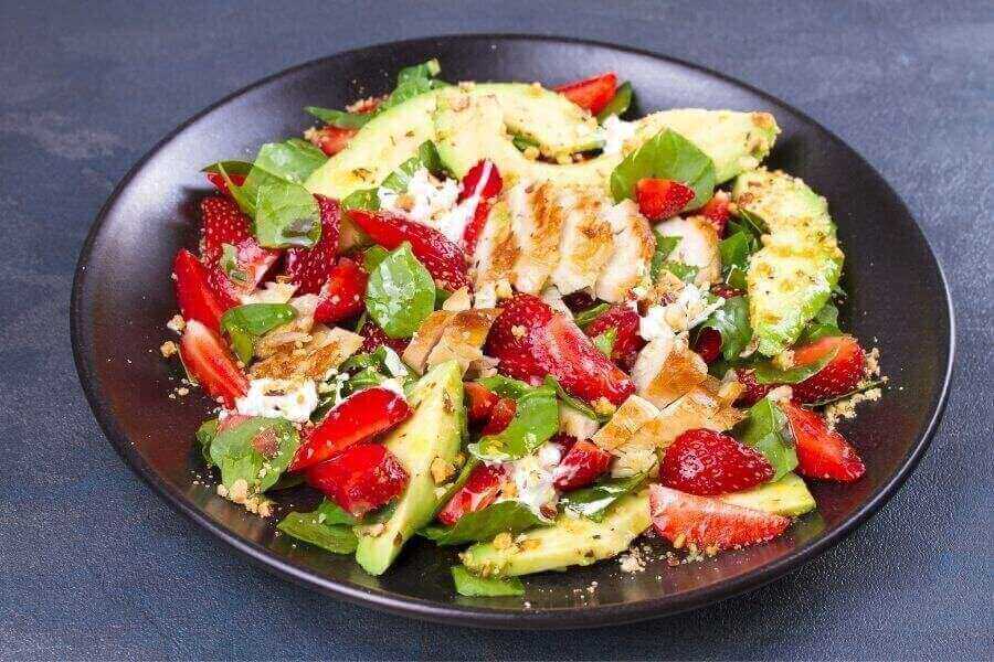 Salad rau chân vịt với dâu tây, thịt gà
